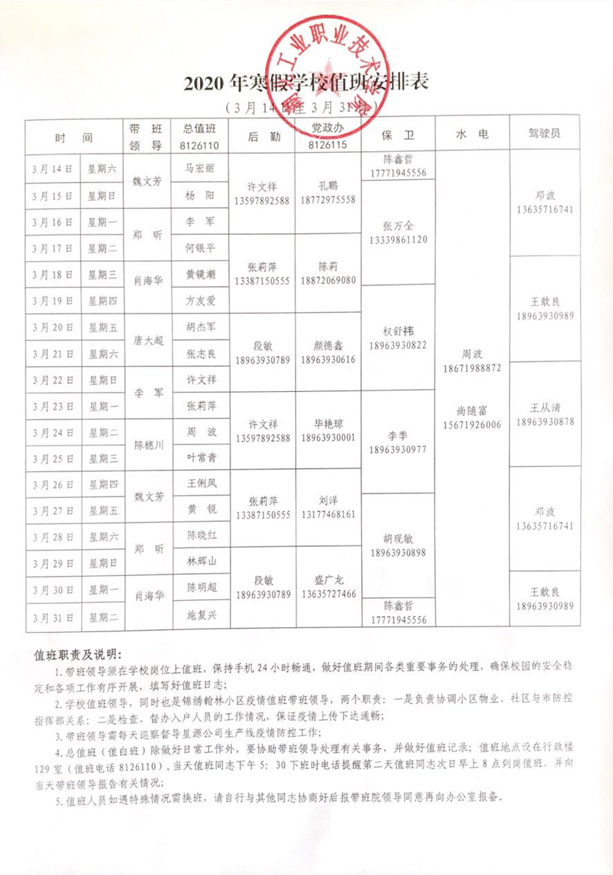 2020年寒假学校值班安排表(3月14日-3月31日)