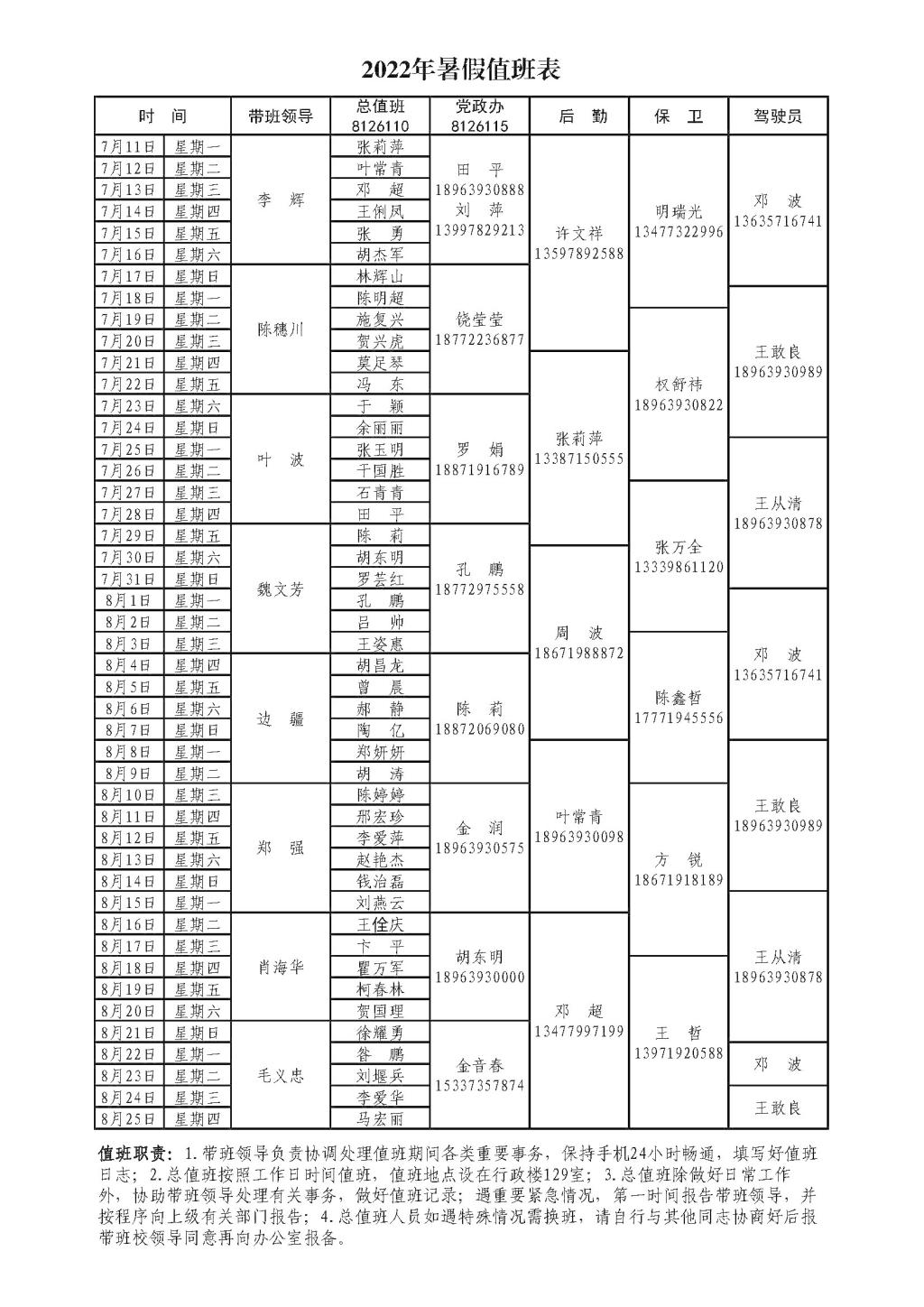 2022年暑假值班表