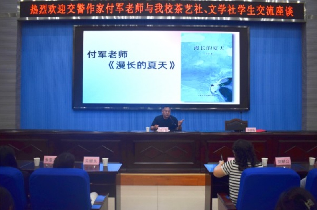 6月6日晚,一场别开生面的文学交流座谈会在学校学术报告厅举行,此次交流座谈会特别邀请到了十堰本土作家、国务院普法办全国微电影大赛二等奖获得者、十堰市公安交管局四大队大队长付军老师,与听众分享他的“二汽”题材小说《漫长的夏天》,并进行现场交流。校党委委员、副校长、党委宣传部部长胡昌龙,生态环境学院、艺术设计学院师生代表,茶艺社、追天文学社、大学生记者团等学生社团成员,市内部分文学爱好者参加座谈会。