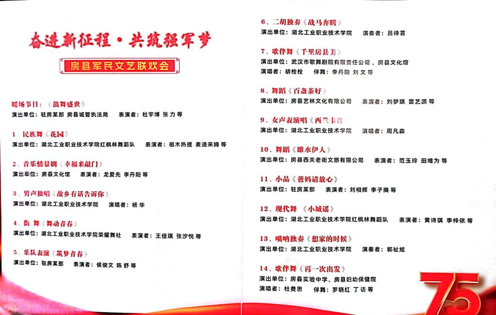 新闻网讯(文/新华歌 图/顾荣昊)9月28日,应十堰市房县文化和旅游局邀请,356体育在线官网大学生艺术团7个节目参加该县庆祝新中国成立75周年大型军民文艺汇演,得到现场一致好评。进一步突显了356官网在学生音乐舞蹈素质拓展教育方面的长足进步。