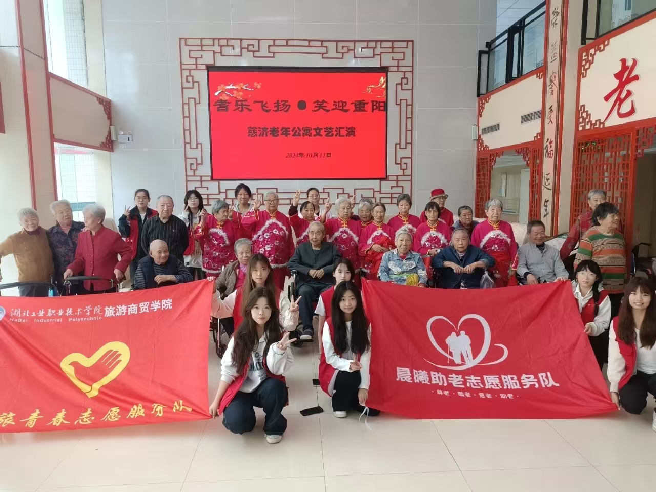 新闻网讯(通讯员 王紫琳 喻永康 张云)金秋时节,阳光明媚,为迎接一年一度的重阳节,10月11日,一场温馨有爱的孝老爱老文艺演出活动在慈济老年护理院如火如荼地展开,来自湖北工业职院的数十位青年志愿者们为老人们送上一场精彩纷呈的表演,为他们带来了节日的温暖与欢乐。