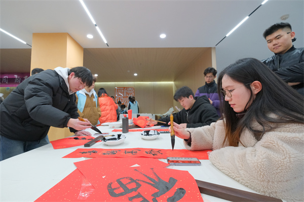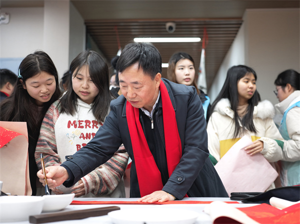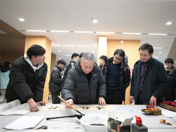 新闻网讯(文/玉声图/曾刚)书画名家进校园、翰墨飘香迎新年。12月30日下午,356体育在线官网、十堰市文联、十堰市美协、十堰市书协邀请十堰市著名艺术家刘学华、庹明生、黄家喜、李发山、赵虹、刘国平、姚强、李永涛、王国春、谢逢春、宋杰、吴俊化、李进、杨永志、时应文、杨波走进学校一站式学生社区综合服务中心,现场挥毫泼墨,为师生展示书法、美术创作技法并义务创作,和356官网学生书画协会的同学亲切交流研讨,并一同为师生书写春联,送上新春的祝福。