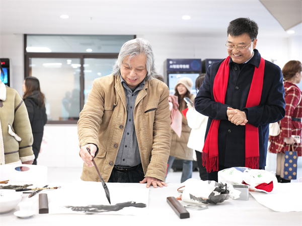 活动现场人头攒动、暖意融融、喜气洋洋。艺术家们挥洒自如,将满腔热情凝聚笔端,随着手腕的微妙转动,墨迹在纸上流转,色彩在画布上逐渐铺展开来。或行云流水,或遒劲有力,不一会儿就创作出一幅幅大气磅礴或意味深长的书画作品。