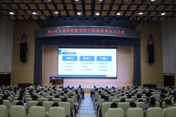 新闻网讯(文/李晓璇 图/张华雪)5月27日下午,学校“和山讲坛”2025年第四期暨党员干部素质提升大讲堂在和山会堂举行,特邀湖北医药学院原党委书记涂汉军教授作为主讲嘉宾,为师生带来了主题为《三个一生(身)》的精彩讲座,校领导、党员干部、师生代表共400余人现场聆听。本次活动由校党委书记边疆主持。