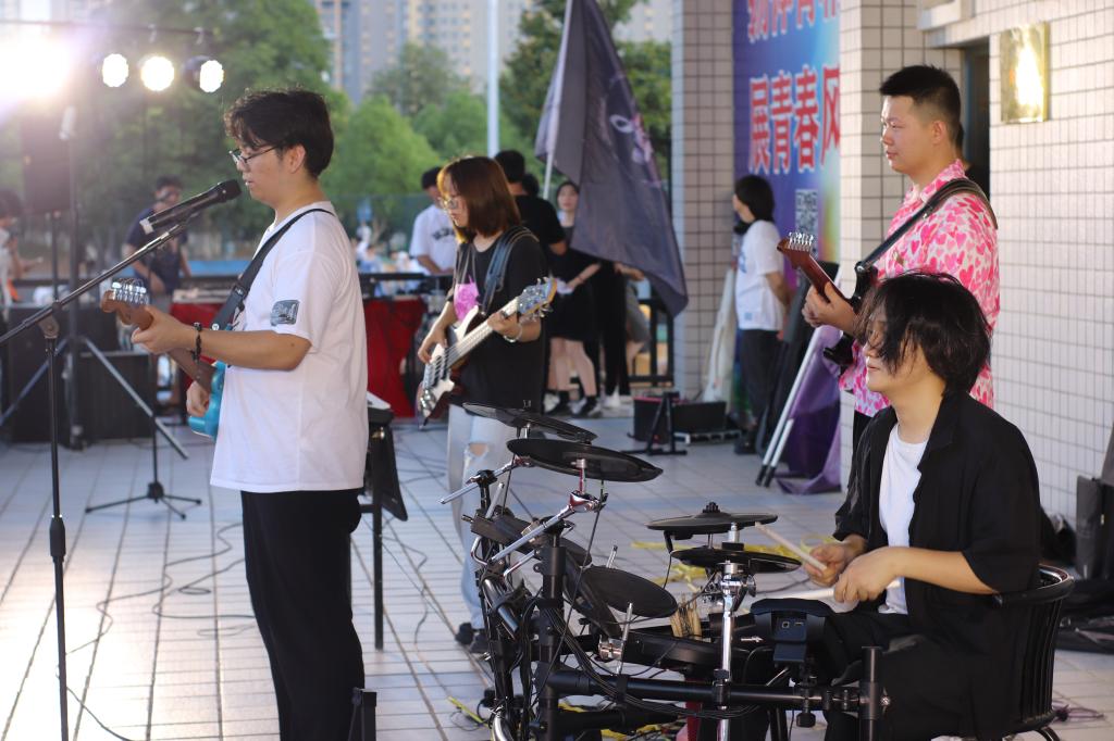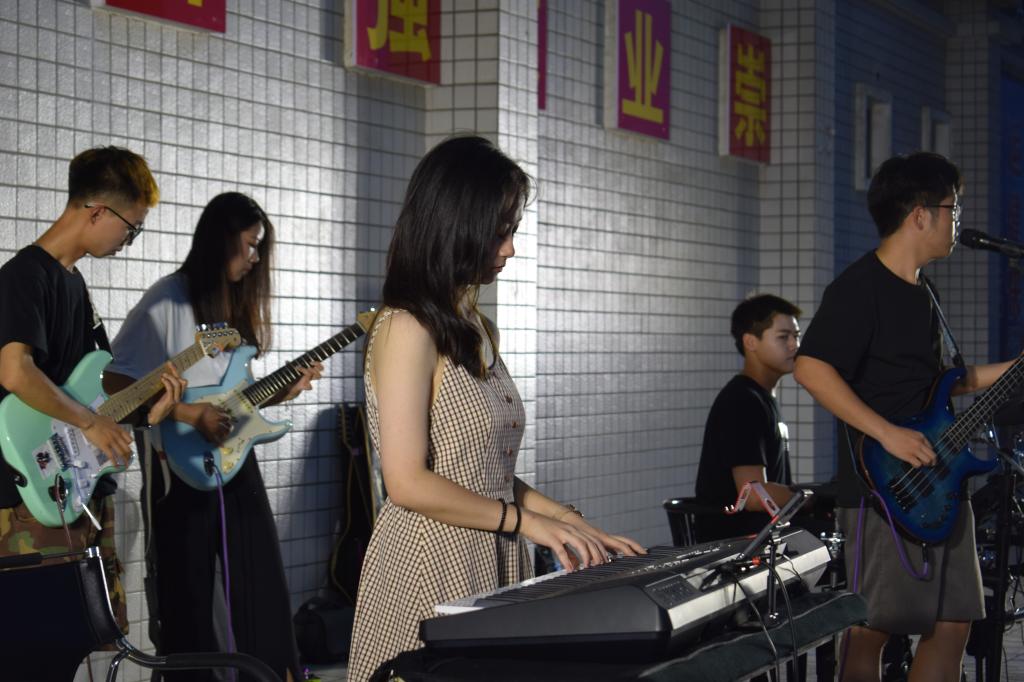 在近四个小时的时间里,无论是乐手还是观众,激情和热情一浪高过一浪,点燃了全场气氛。来自356官网的天一乐团“冰点乐队(icepoint)”一上场,尖叫声、呐喊声此起彼伏,一曲《极乐都市》、《奇迹再现》更是引得全场掌声雷动。来自汉江师范学院贰天乐队的安琦带着《想去海边吗》、《爱人错过》等金曲,轮番上台、激情演奏,感染了在场所有观众。