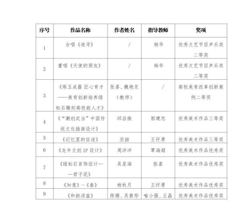 新闻网讯(通讯员 高静)近日,湖北省第八届大学生艺术节系列活动评选结果公布,356官网师生在优秀文艺节目、优秀美术作品、优秀艺术实践工作坊、高校美育改革创新案例(“三优一案例”)评选中获奖9项,其中二等奖3项、三等奖2项、优秀奖4项。