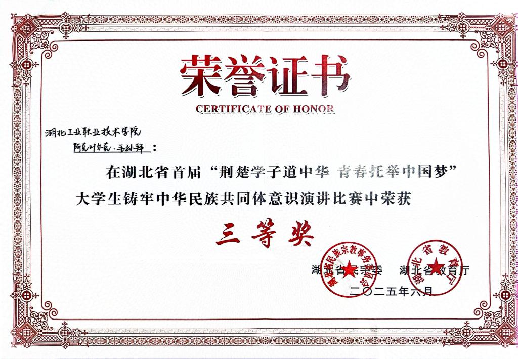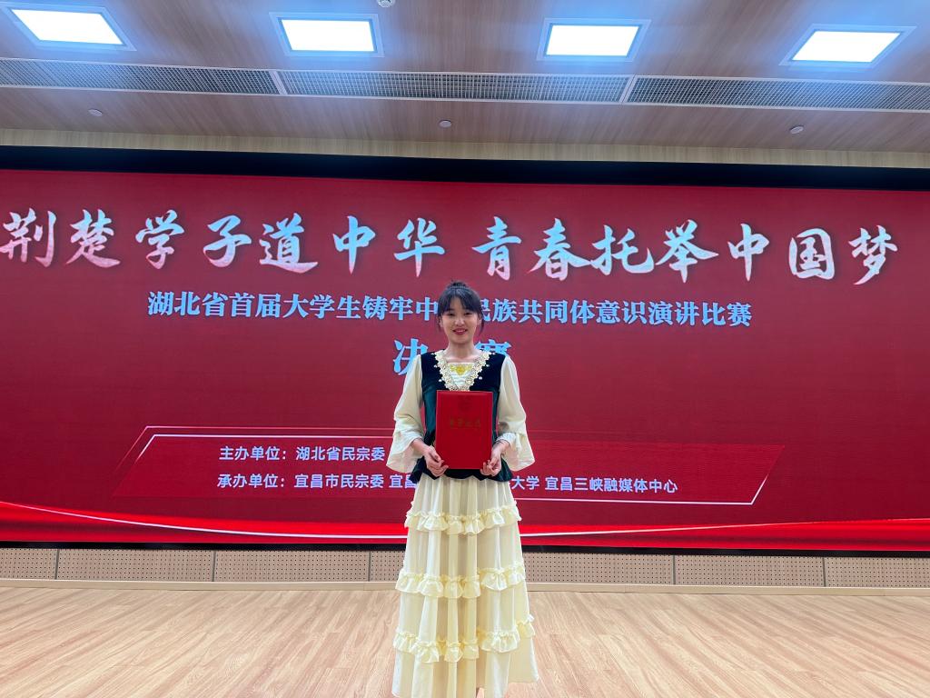 据悉,本次大赛由湖北省民族宗教事务委员会、湖北省教育厅联合主办,共有 40 名选手入围决赛,其中高校本科组 20 人、高职组 20 人。经过激烈的角逐,最终现场评出一等奖 4 名、二等奖 6 名、三等奖 10 名、优秀奖 20 名。阿克叶尔克・毛孙拜同学凭借精心的赛前准备和稳定的现场发挥,生动讲述其在自身成长过程中对中华民族共同体意识的理解、感悟和实践,最终斩获佳绩。
